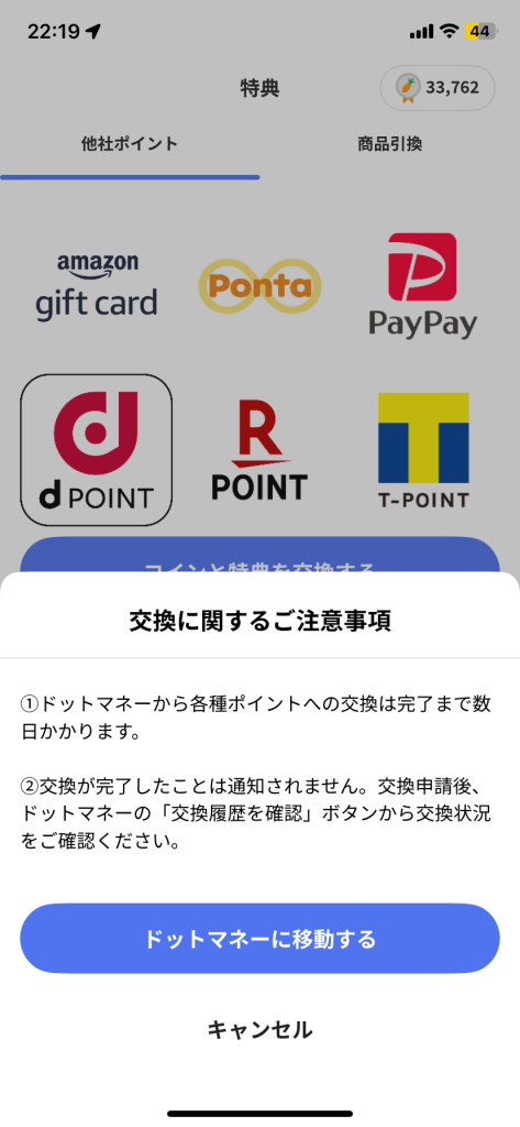 ③交換に関する注意事項を読んでから「ドットマネーに移動する」をタッチします。