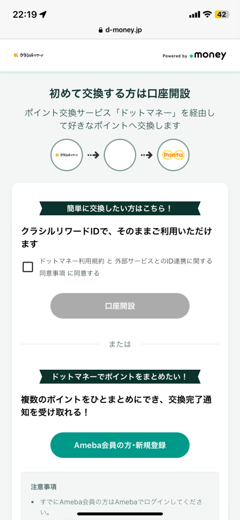 ⑤初めて交換する際には下の画面が表示されるので、チェックボックスにチェックを入れて「口座開設」をタッチします。