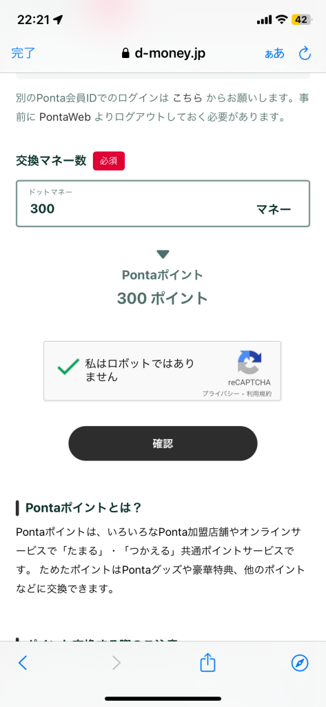 ⑨交換するマネー数を入力し、「私はロボットではありません」にチェックを入れて「確認」をタッチします。