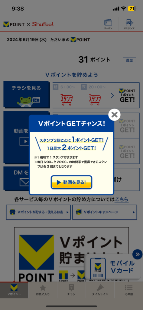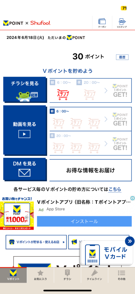 このアプリではユーザーがチラシや動画広告を閲覧することで他のアプリと比較して、より効率的にVポイントを貯められます。