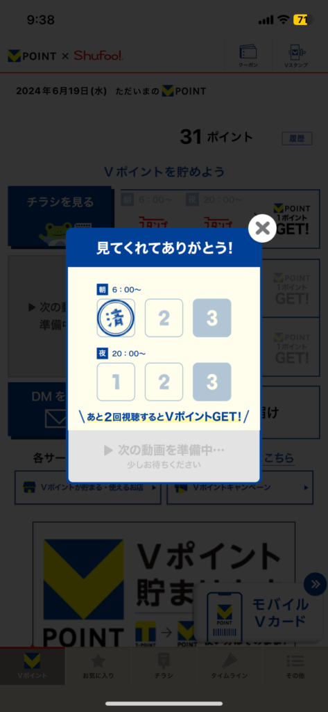 広告視聴が終わると、下の画面のようにスタンプが1つ付与されるので、このスタンプを3つ貯めるとVポイントを1ポイントもらうことができます。