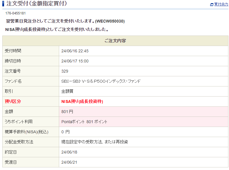 今回は、TikTokLiteとトリマで貯めたPontaポイント500ポイントを用いて、毎度恒例の「SBI-SBI・V・S&P500インデックス・ファンド」を購入しました!