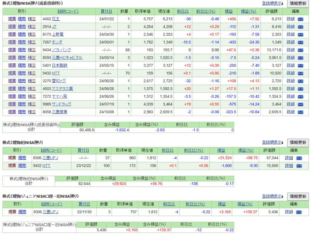 投資信託について、最近はオルカンを積立で購入しているのみなので全体にあまり変動はありません。
